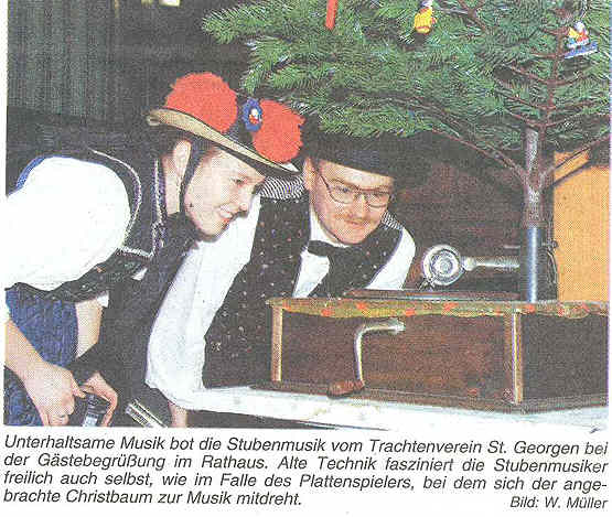 Aus: Südkurier, Ausgabe 27. 12. 2000 von Werner Müller Gästebegrüßung wurde Heimspiel Stubenmusik vom Trachtenverein St. Georgen spielte auch für Bergstädter auf St. Georgen. Wenig Beachtung fand die weihnachtliche Begrüßung der Feriengäste von St. Georgen im Aufenthaltsraum der Tourist Information im Rathaus.Obwohl Jörg Lembeck, Leiter der Tourist Info, sich im Vorfeld alle Mühe gab, den Termin bei den Vermietern anzukündigen. So wurde die Begrüßung ein Heimspiel von wenigen St. Georgernern, welche sich eher zufällig dazu einfanden. Dies tat der Runde keinen Abbruch und Jörg Lembeck konnte dazu die Stubenmusik vom Trachtenverin St. Georgen begrüßen. Am Hackbrett spielte die Leiterin der Gruppe, Beate Weißer, die Gitarre zupfte Silvia Grüneis, Leopold Quitt spielte die Violine und am Akkordeon waren Martin Grießhaber und Ramona Weißer. Recht unterhaltsam waren die zu Gehör gebrachten Stücke. Alte Volksweisen und Weihnachtslieder wechselten sich ab. Die Unterhaltung kam dabei nicht zu kurz und schnell war eine heimelige Stimmung zu Glühwein und Weihnachtsgebäck vorhanden. Recht interessant war die abschließende Vorführung dreier Ausstellungsstücke vom Phonomuseum. Theo Maier, von Jörg Lembeck als "zuverlässiger wie wir selbst" vorgestellt, gab mit erläuternden Worten zum Orphenium und Orchestrion einen Einblick in die "Musikkonservierung" Anfang des vergangenen Jahrhunderts. Von Werner Müller erfuhren die Gäste Wissenswertes über das Welte Mignon Reproduktionsklavier, das als besonderes Schmuckstück angekündigt wurde. |