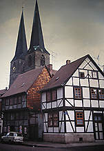 Der eigentliche Höhepunkt des Jahres 1992 war das Gautrachtentreffen, das im Juni in St. Georgen durchgeführt wurde. Für viele Mitglieder des Trachtenvereins war die Reise nach Halberstadt in Sachsen Anhalt viel eindrücklicher, weil zum ersten mal nach der Wende in die ehemlige DDR gefahren wurde. Land und Leute, sowie die Verhältnisse in den neuen Bundesländern selbst kennen zu lernen war etwas besonderes. In Halberstadt führte das Verkehrsamt, zur Förderung des Fremdenverkehrs, einen Schwarzwälder Abend durch, der vom Trachtenverein St. Georgen und der Trachtenkapelle Buchenberg bestritten wurde. Das Publikum war begeistert, zumal Volkstrachten in der früheren DDR nicht unterdrückt wurden. Am nächsten Tag konnte noch Halberstadt, sowie das malerische Quedlinburg, schon zu DDR-Zeiten ein Vorzeigeort, besichtigt werden. Auch hier zeigte sich, dass viele Häuser und Wohnungen, die nicht direkt im Zentrum sind, in sehr schlechtem Zustand waren. Mit der Erkenntnis, dass für den Aufbau Ost noch viel Geld benötigt wird fuhr man zurück in den Schwarzwald. | |